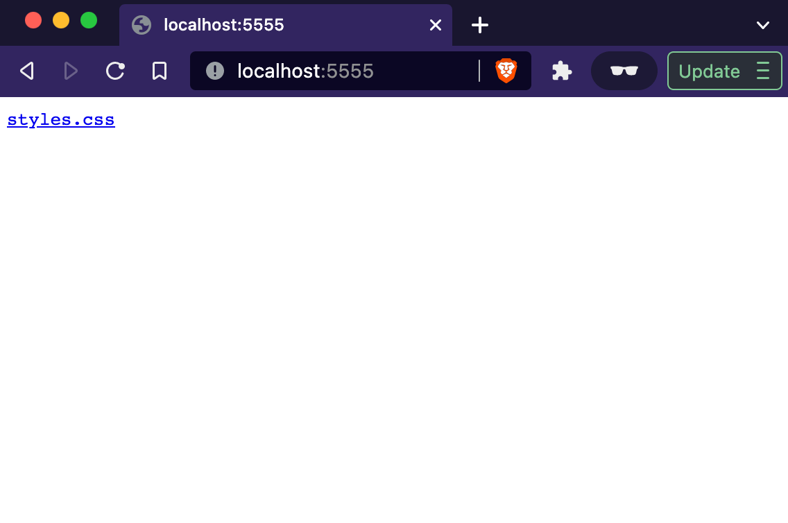 Now if you visit localhost:5555/files/ you will see the index.html page and localhost:5555/files/styles.css will display the css file ✅.